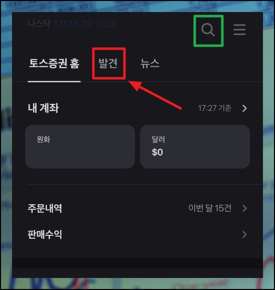 앱을 실행하면 화면 아랫쪽에 여러 메뉴를 찾을 수 있는데요. 여기에서 [증권]을 선택합니다. 화면이 바뀌면 우측 상단에 돋보기 모양의 검색 버튼이 있는데요. 평소에 관심이 있는 해외주식이 있다면 검색을 통해 종목을 찾아주세요. 아니면 저처럼 [발견] 메뉴를 선택하여 투자할만한 종목이 있는지 살펴보면 됩니다.