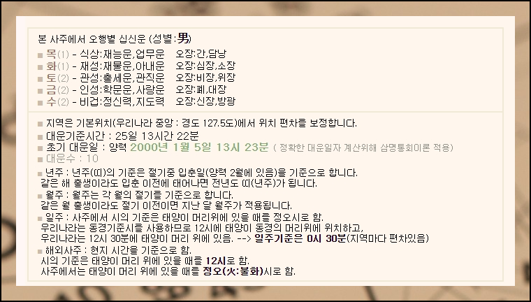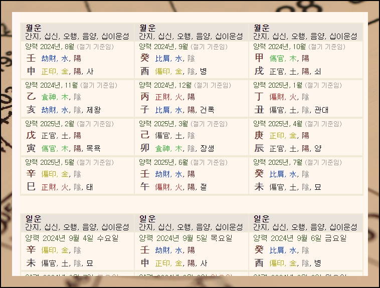 대운, 세운, 월운, 일운에 대한 내용을 살펴볼 수 있는데요. 제가 앞서 보여드린 만세력 풀이와는 차이가 있습니다. 너무 간단하게 나오고, 한자가 많은데요. 사주 공부하는 분들이라면 요긴하게 사용하실 수 있으실 거에요.