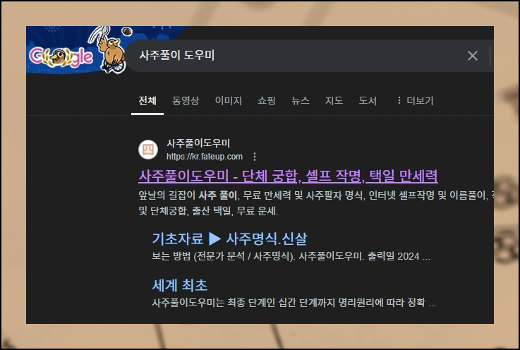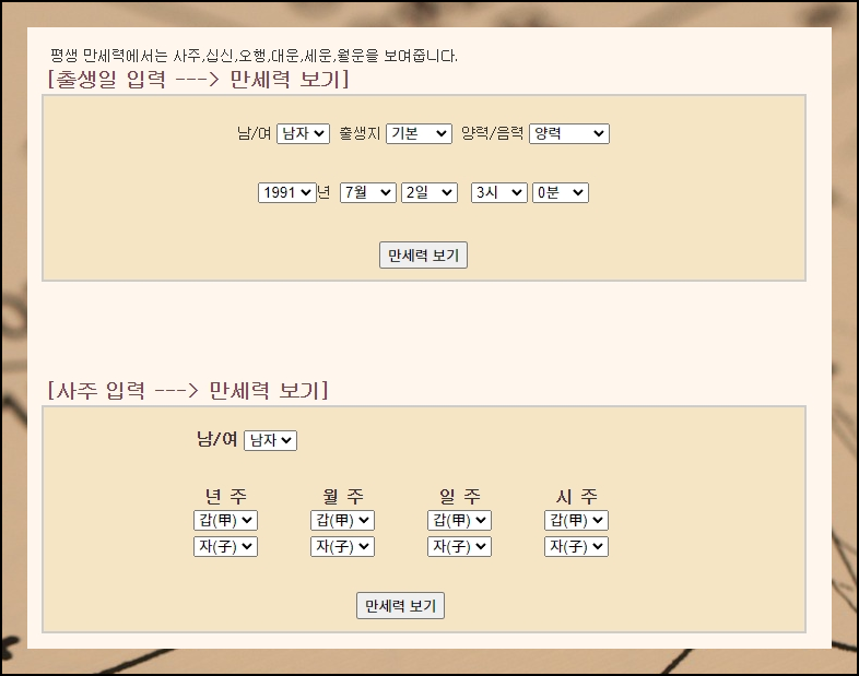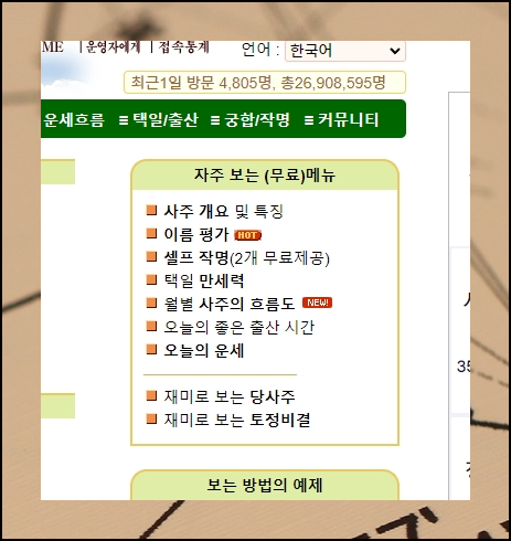두 번째로 알려드리는 곳은 첫 번쨰에 비해 풀이 내용이 상세한 편입니다. 바로 "사주풀이 도우미" 사이트인데요. 개인적으로 이곳이 만세력 보기 편리하다고 생각합니다. 당연히 무료 서비스로 제공하고요. 일단 사주를 보기 위해 몇 가지 정보를 입력해 주세요. 앞서 입력했던 사주 정보와 동일한 내용입니다. 사이트 메인화면에 보면 무료로 볼 수 있는 역술 서비스가 여러 가지 나타나는데요. 여기에는 "택일 만세력"이 포함되어 있습니다.