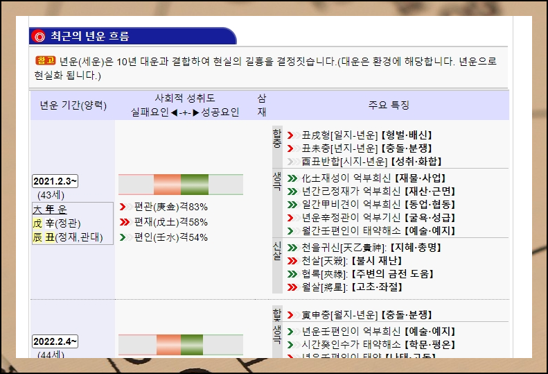 기본적으로 만세력을 보려고 할 때에는 이렇게 대운과 연운에 대한 흐름을 살펴보아야 합니다. 왜냐하면 우리 운명에 대하여 큰 영향을 미치는 2가지 요소이기 때문입니다. 대운의 경우에는 10년 단위로 변하고, 연운은 1년 단위로 바뀌는데요. 제가 이용하는 무료 역술 사이트에서는 대운과 연운에 대한 해석 또한 제공하고 있습니다.
