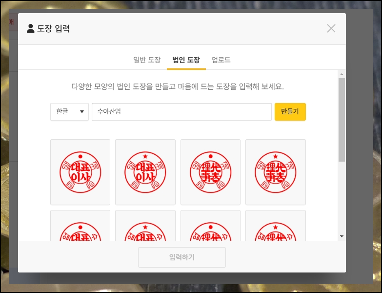 두 번째는 법인용 무료도장 만들기 방법을 알려드릴게요. 이 경우에도 기업의 이름만 한글이나 한자로 입력하면 됩니다. 그럼 여러 가지 디자인이 나타나는데요. 이 중에서 하나 고르면 돼요.