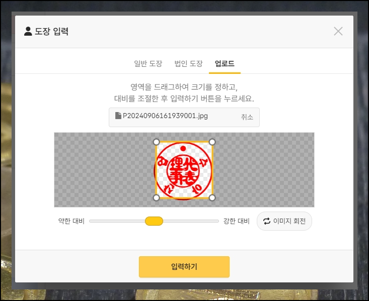 실물로 된 인감을 보유하고 있는 분들의 경우에는 [업로드] 메뉴를 선택해 보세요. 그 다음 해당 인감을 찍은 사진을 이곳에 업로드 합니다. 그럼 배경이 투명인 이미지 파일 만들기 가능해요.