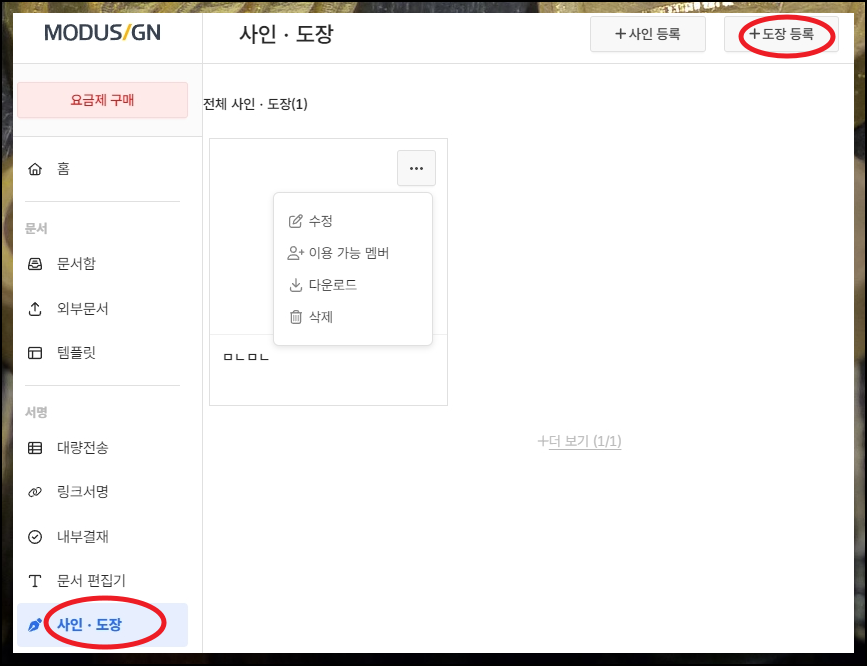 사이트에 로그인을 하게 되면 다음과 같은 관리 페이지가 열립니다. 여기에서 좌측에 보면 여러 가지 메뉴가 배치되어 있는데요. 서명 카테고리 부분을 보면 "도장" 메뉴를 찾을 수 있어요. 해당 메뉴를 클릭하면 제가 만든 결과물이 나타나는데요. 제 경우에는 한 가지 만들어 놓은 것이 있었습니다. 수정, 다운로드, 삭제를 할 수 있어요. 처음 이용하는 분들은 도장 만들기 먼저 시작해야 합니다. 사이트 화면에서 우측 상단에 있는 [등록] 버튼을 눌러주세요.