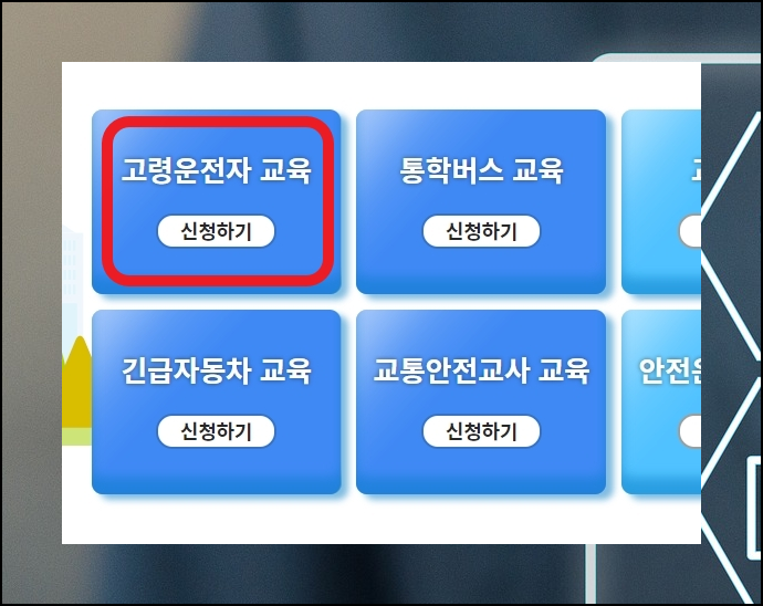 3. 교통안전 교육센터 사이트에 접속해주세요. 사이트에 접속하면 고령운전자를 대상으로 하는 교육 서비스 신청 버튼이 있습니다. 75세이상 운전면허 적성검사 갱신을 받는 분들이라면 꼭 진행해야 하는 것이죠.