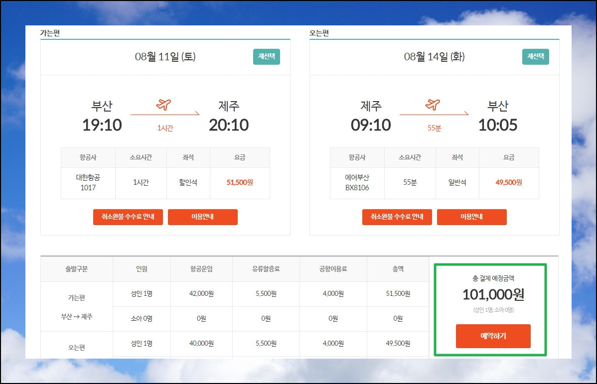 티켓 정보를 최종 확인을 한 후에 예약을 버튼을 누르시면 됩니다. 부산에 있는 김해 국제공항에서 제주로 갔다가 돌아오는 날짜와 시간을 확인하고, 항공권 가격에 포함이 되는 항공운임, 공항이용료, 유류할증료 등을 살펴보세요.
