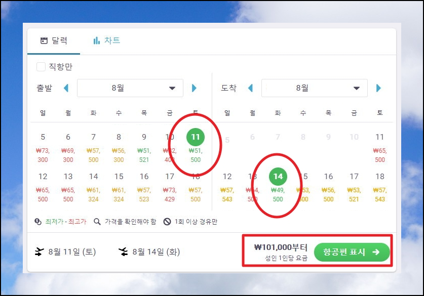 최저가 금액이 적혀 있는 달력에서 녹색으로 된 금액을 찾아보세요. 8월은 성수기이기 때문에 다른 날에 비해 항공권 가격이 높은 편입니다. 그렇지만 그 중에서 저렴하게 예약을 할 수 있는 방법이 있는데요. 녹색으로 금액이 표시된 날짜를 선택하면 됩니다. 저는 8월 11일에 김해에서 출발해서 14일에 제주에서 돌아오는 항공편을 찾았습니다. 왕복 항공권의 가격이 10만원 정도로 저렴한 편입니다.