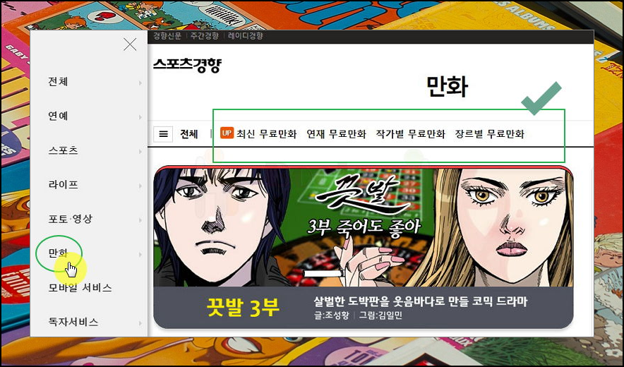 2. 여러 가지 종류를 만나볼 수 있어요. 스포츠 경향 사이트에서 메뉴에 있는 [만화]를 클릭해 보세요. 그럼 해당 페이지가 열리는데요. 여러 가지 종류의 만화 카테고리를 만나볼 수 있어요. 가장 먼저 만나볼 수 있는 것은 현재 연재작인데요. 하루 하루 조금씩 보는 재미가 있어요. 연재작 외에는 모두 완결작이니 참고해 주세요.