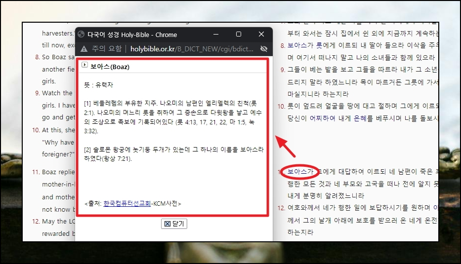 성경읽기 진행 중에 해석이 안되거나 해석을 했음에도 종교적인 의미를 알기 어려운 단어가 있을 수 있습니다. 이러한 경우에는 해당 단어를 마우스로 클릭해 보세요. 그럼 크리스챤 전용 온라인 사전이 나타납니다. 이를 통해 해당 단어가 가지고 있는 의미를 파악할 수 있어요.
