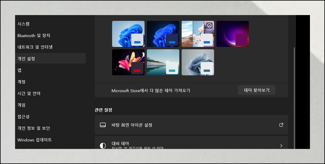 가끔 바탕화면 아이콘이 사라졌어요 문제를 겪는 분들이 많은데요. 그런 일을 대비하여 개인 설정 화면을 알아두면 좋아요. 개인 설정에서는 배경화면은 물론이고, 윈도우 꾸미기에 관련된 다양한 옵션이 있습니다. 테마 메뉴를 찾아서 선택해주세요. 세 번째에 위치해 있으니 쉽게 찾을 수 있어요. 윈도우의 모든 디자인 요소를 이곳에서 관리할 수 있답니다.